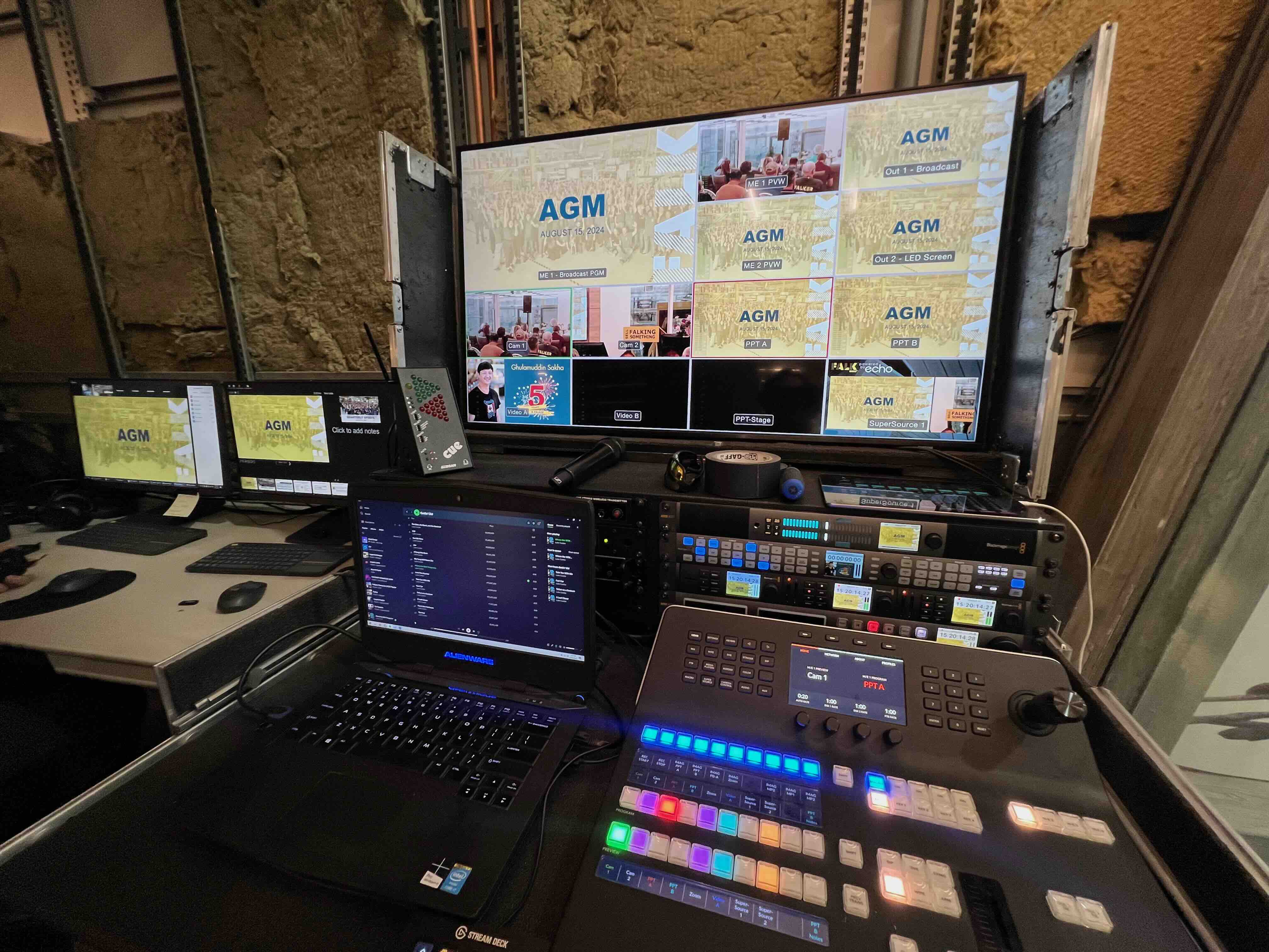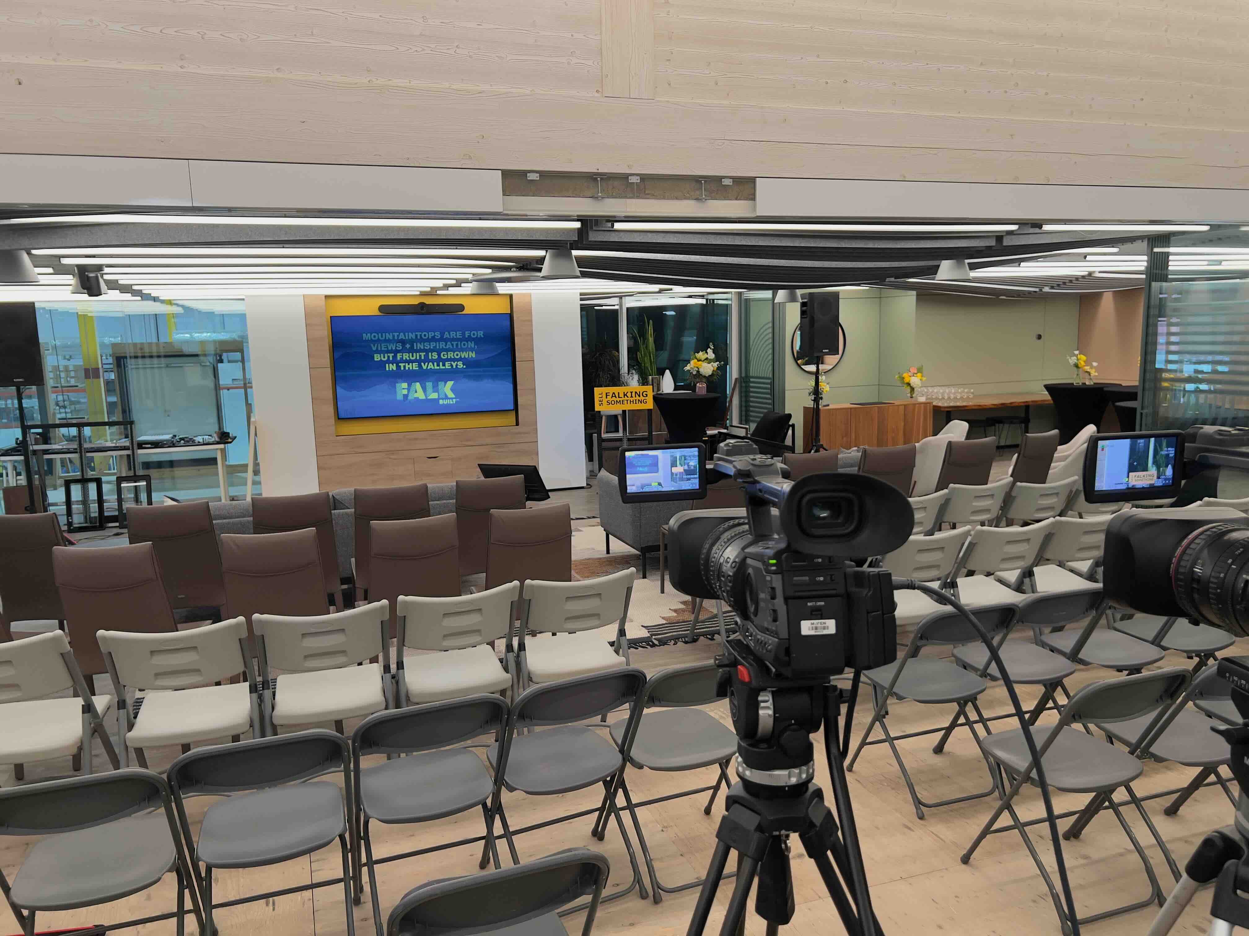 Our approach focuses on a high-efficiency, "single-day" workflow. We deploy a streamlined two-person crew to manage setup, live production, and strike, ensuring a minimal footprint within Falkbuilt's operational environment. To maximize reliability in a busy industrial setting, we utilize cell-based internet backups and a robust technical suite to manage a Zoom Webinar feed. Our technical director seamlessly switches between camera angles, presentation slides, and remote Zoom presenters, while simultaneously managing wireless audio and a live sound system for the in-person audience. This reliable, cost-efficient solution ensures that Falkbuilt’s commitment to innovation is reflected in their communication with stakeholders worldwide.