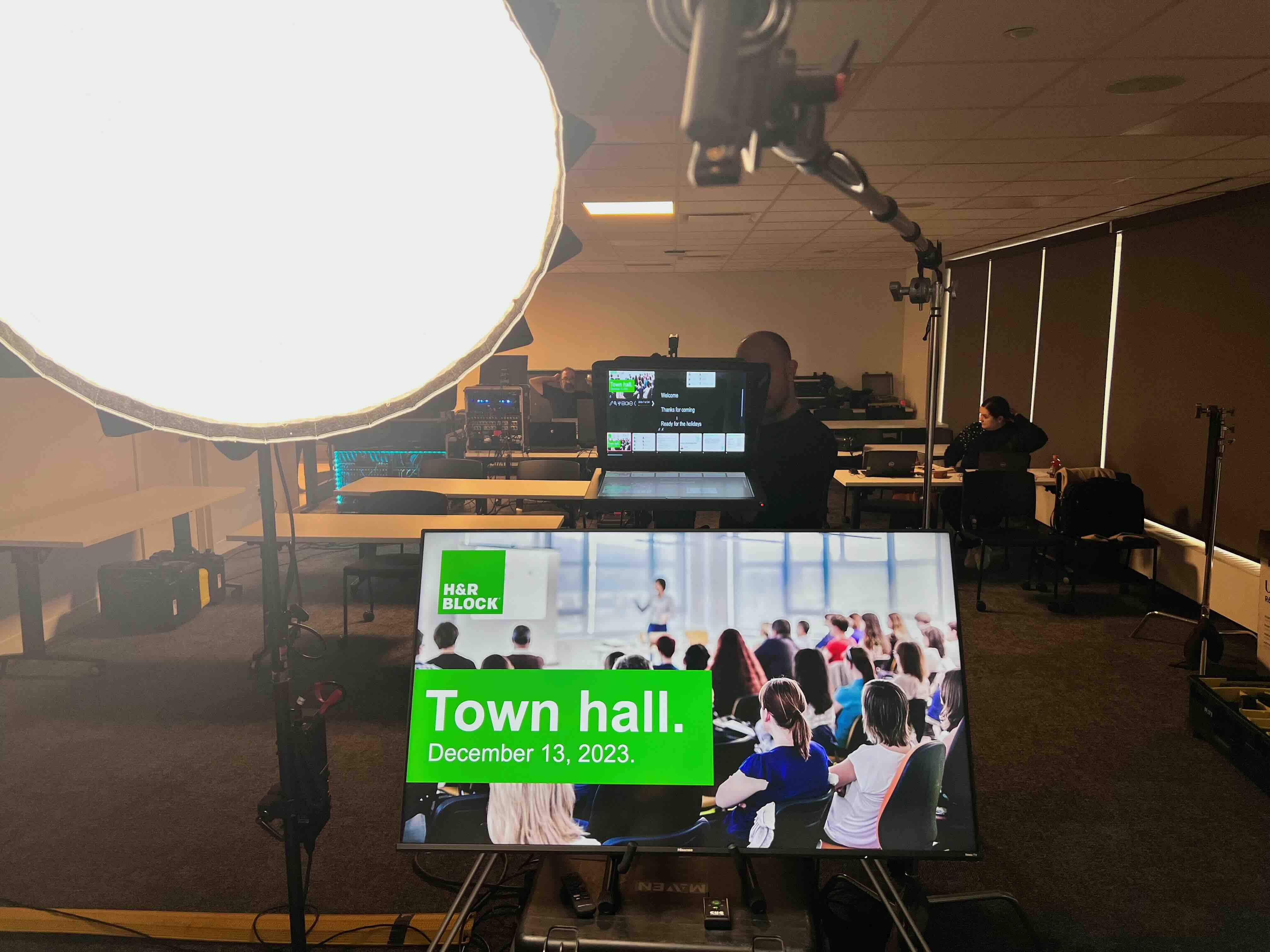 To ensure a professional on-camera appearance, we deploy a studio lighting kit customized to H&R Block’s brand colors and provide essential presenter support through on-camera teleprompters and comfort monitors. Our process includes a dedicated rehearsal day to refine scripts and cues, ensuring a flawless live execution. For a truly national reach, we provide bilingual broadcast support, running a separate live stream with simultaneous interpretation alongside the English feed. Every session is delivered via Microsoft Teams and recorded in high-definition for internal archival and post-event distribution.