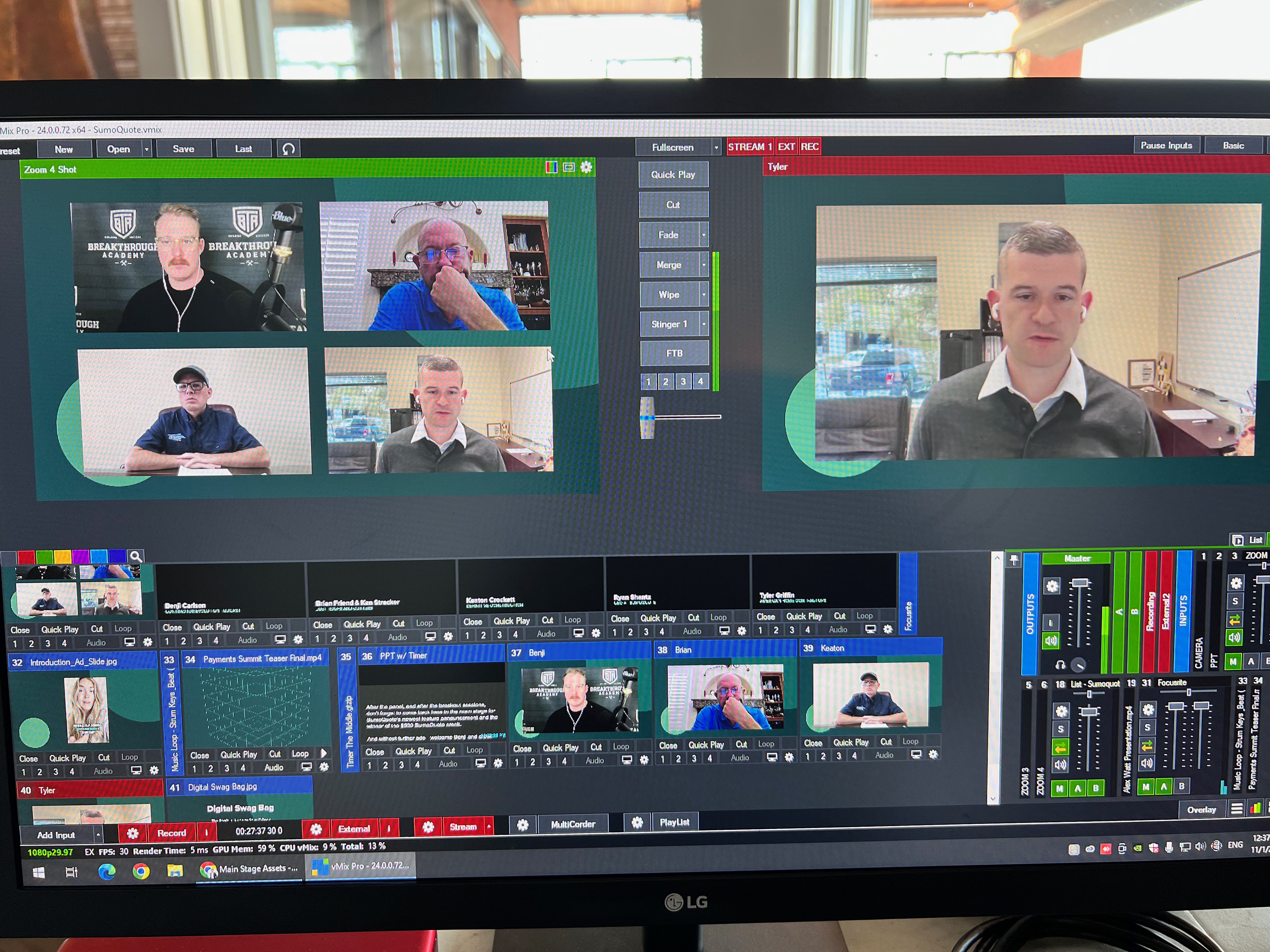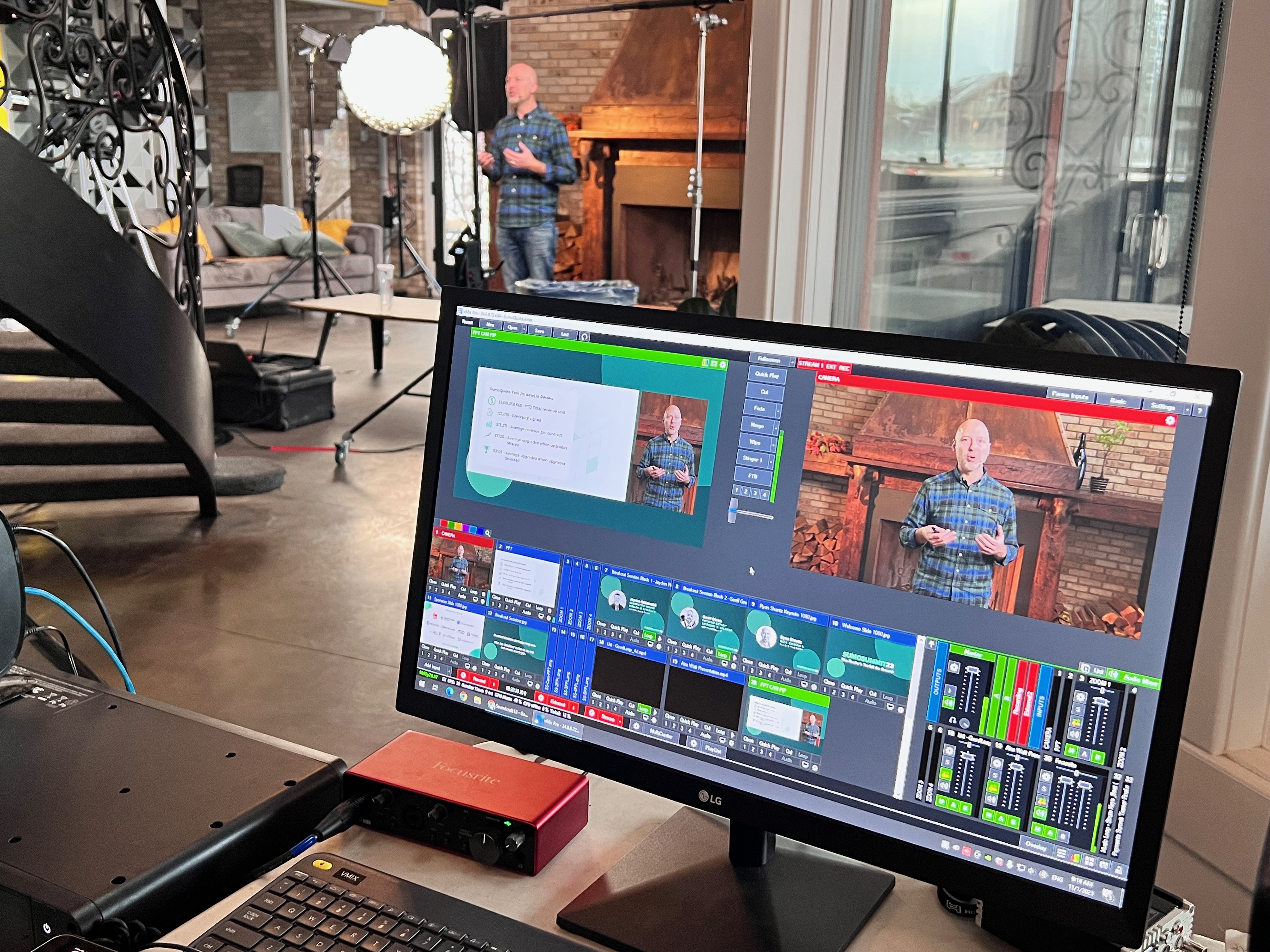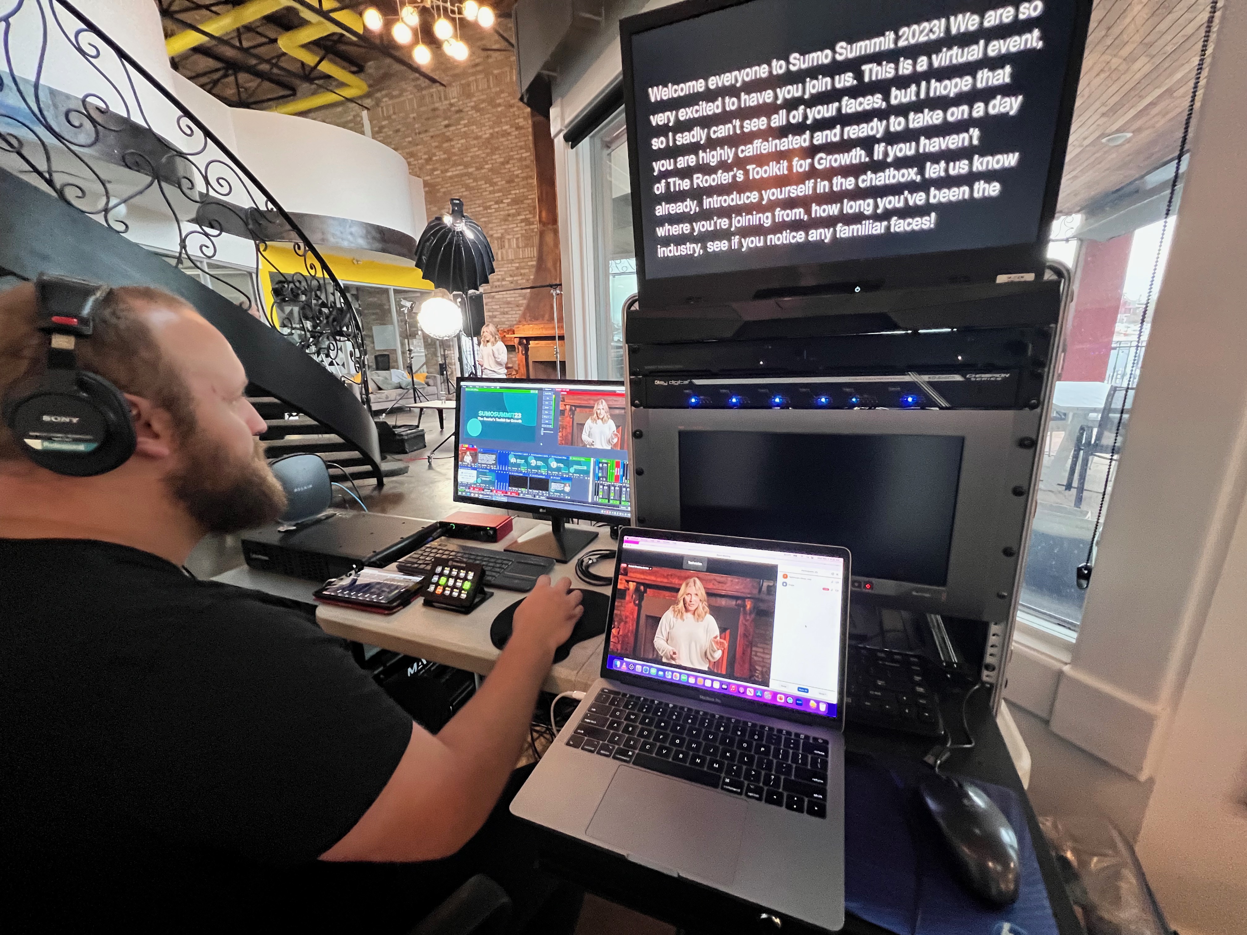 To elevate the production value beyond a standard webinar, Maven utilized a dual-camera setup and an upgraded broadcast kit specifically designed to bring virtual presenters onto the "main stage" via dedicated set displays. Our three-person professional crew managed the live sound reinforcement, multi-camera switching, and the complex technical patch required to stream directly to the Hopin event platform. By providing full technical planning and a rock-solid cellular internet backup, Maven ensured a professional, TV-quality viewer experience for the duration of the summit. Following the event, we delivered live-edited recordings of each individual presentation for SumoQuote’s internal archives.